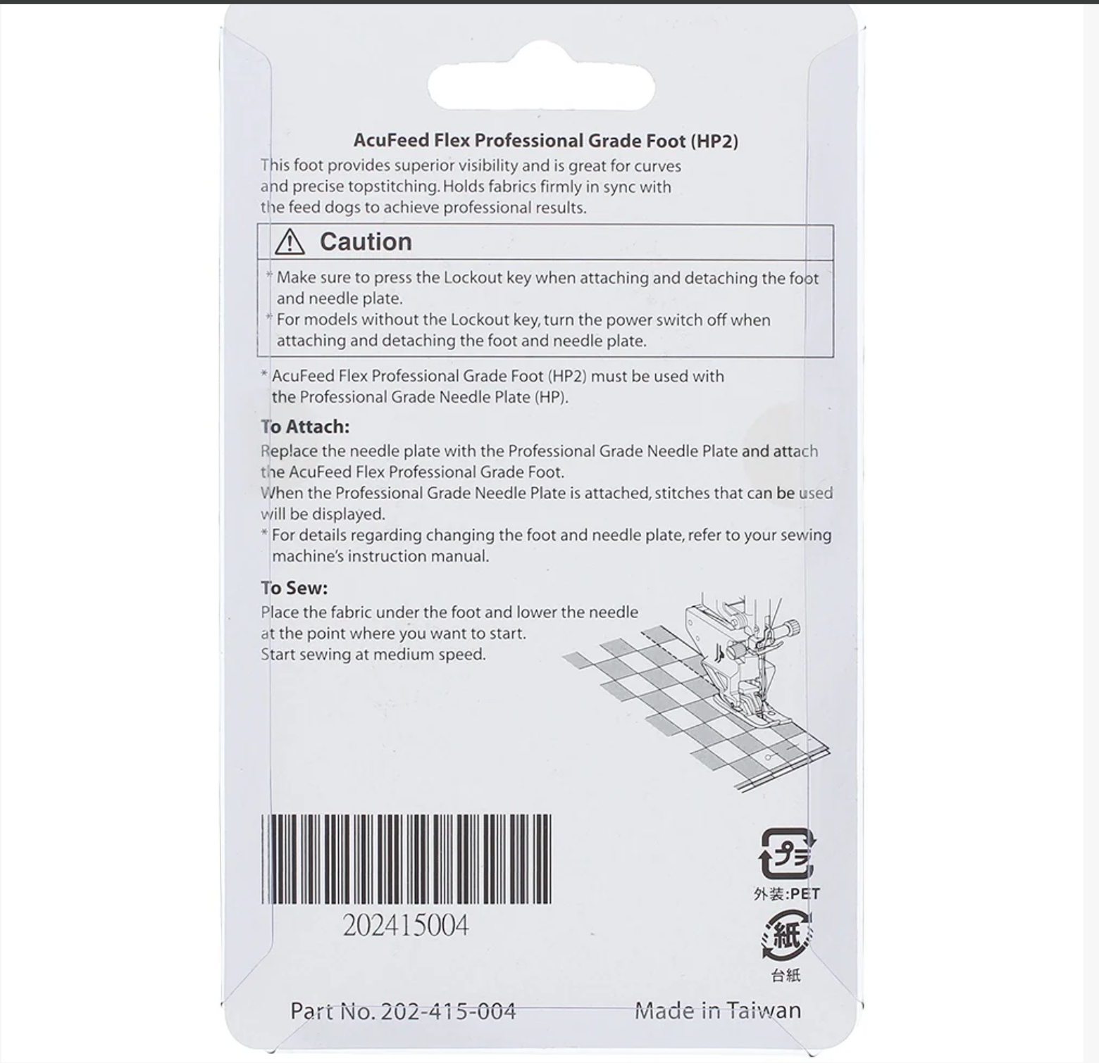 Janome's 9mm Acufeed Straight Stitch Foot (HP2) moves in sync with the fabric feeders to produce professional finishes. Ideal for use in sewing curves and topstitching. Janome's 9mm Acufeed Straight Stitch Foot (HP2) utilizes the left side of the fabric feeders and is intended for use with Professional Grade Needle Plate HP (with machine).