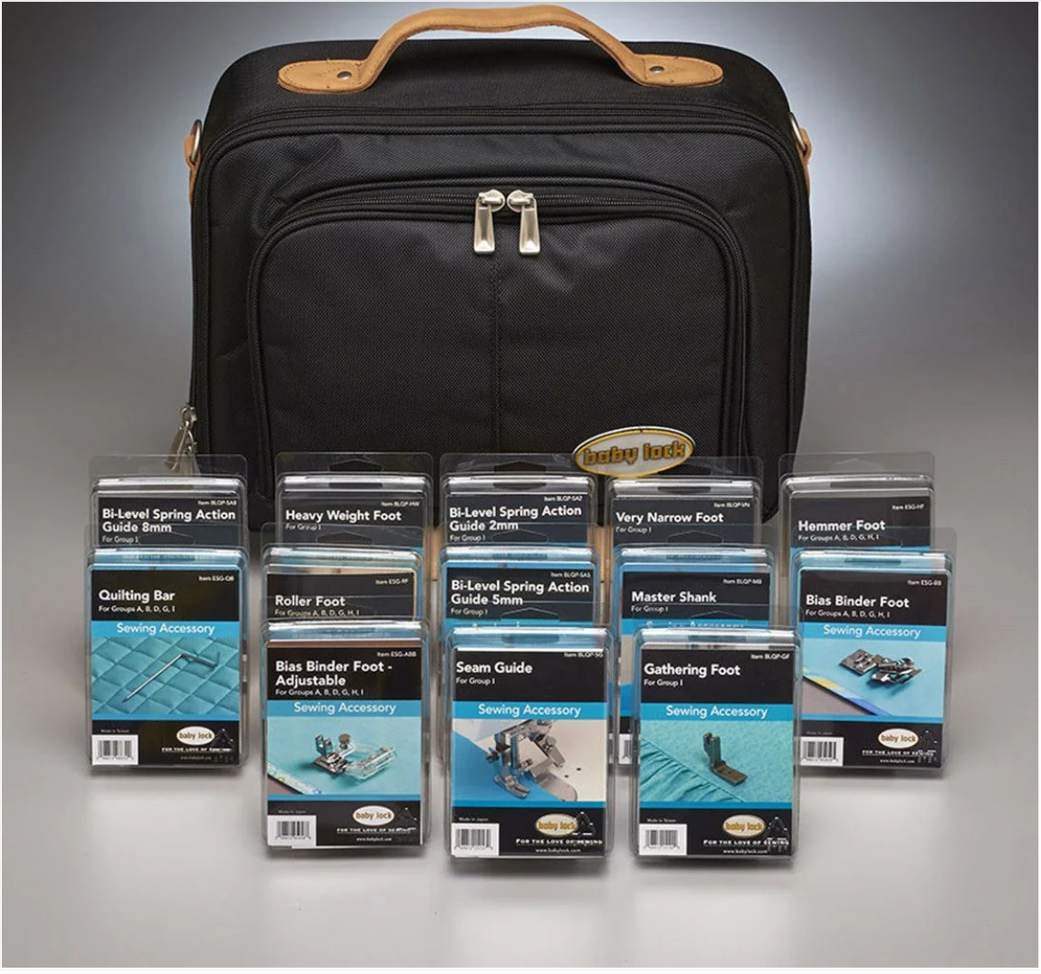 This kit for your Baby Lock Accomplish, Jane or Quilter’s Choice Professional machine includes additional feet to help you explore new creative options. These 13 feet come in a handy carrying case.