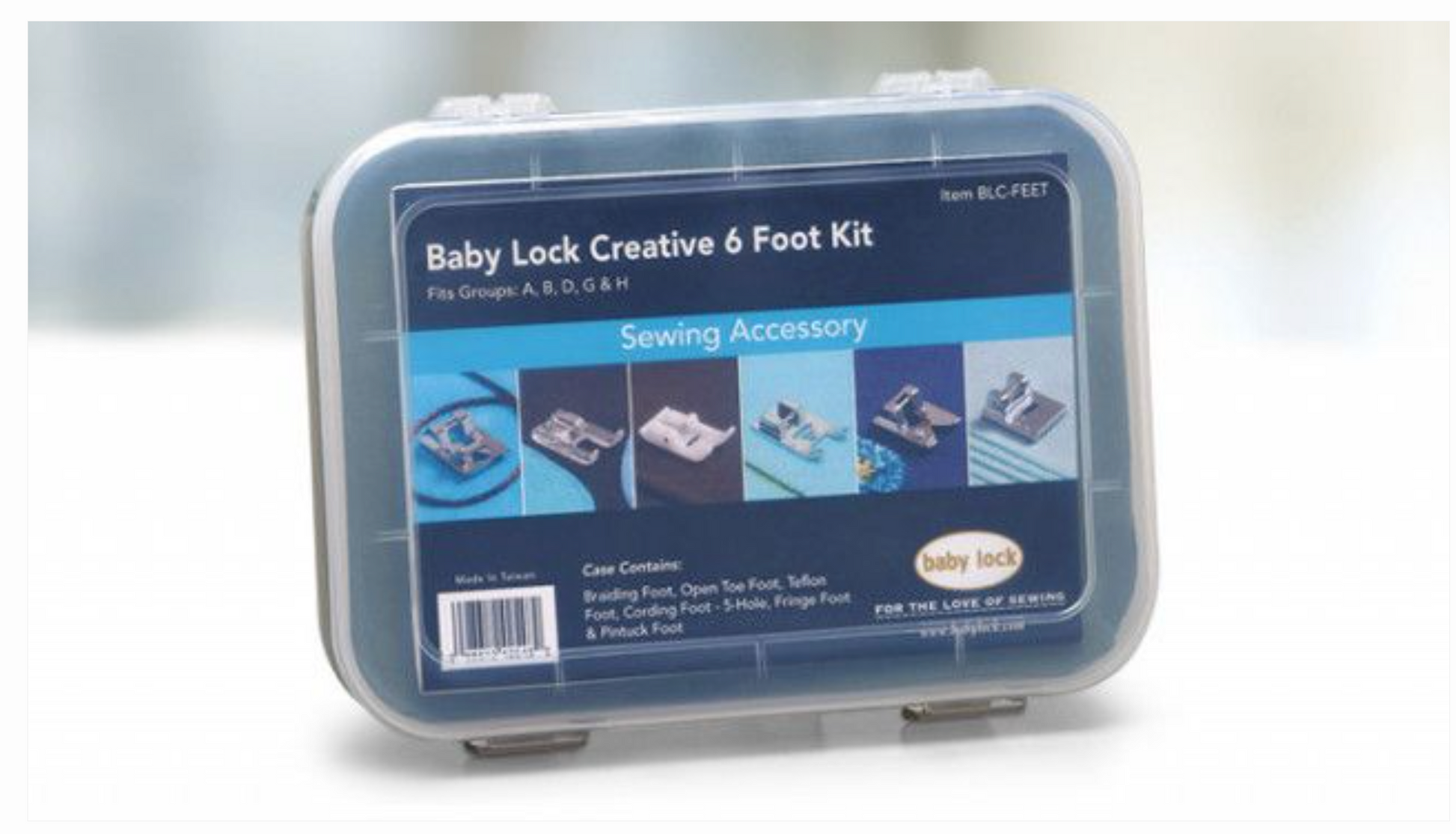 This kit contains a braiding foot, an open toe foot, a non-stick foot, cording foot, fringe foot and a pin-tuck foot all in a handy see-through case.