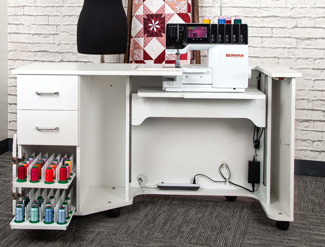Equipped with a pull-out thread cone rack that neatly holds all your serger threads and a generous open-front design for easy looper threading—perfectly suited for BERNINA L 850/L 890 sergers.