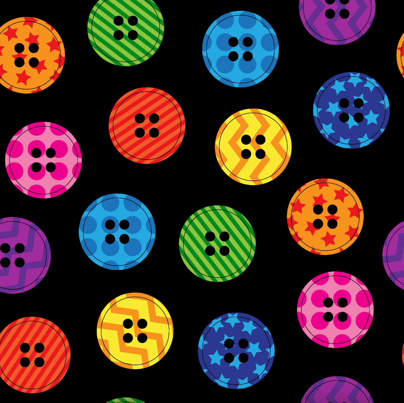 Buttons, buttons, who’s got the Bright Buttons? We do, and you can too. This heavy-duty upholstery fabric dazzles with brightly colored and patterned buttons scattered playfully across a black field.