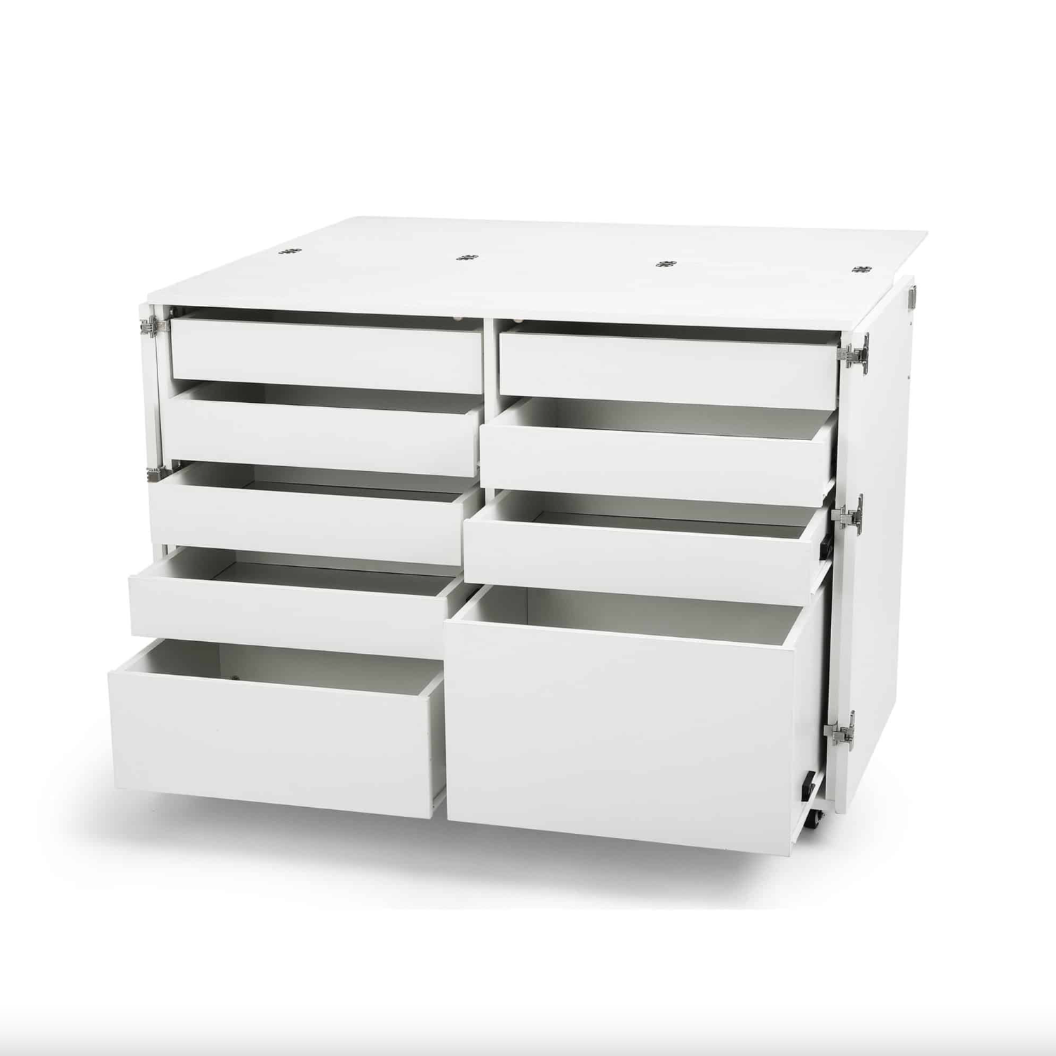- 9 drawers of storage (1 large, 1 medium and 7 small), to store notions, crafting materials, fabric, and other sewing accessories
