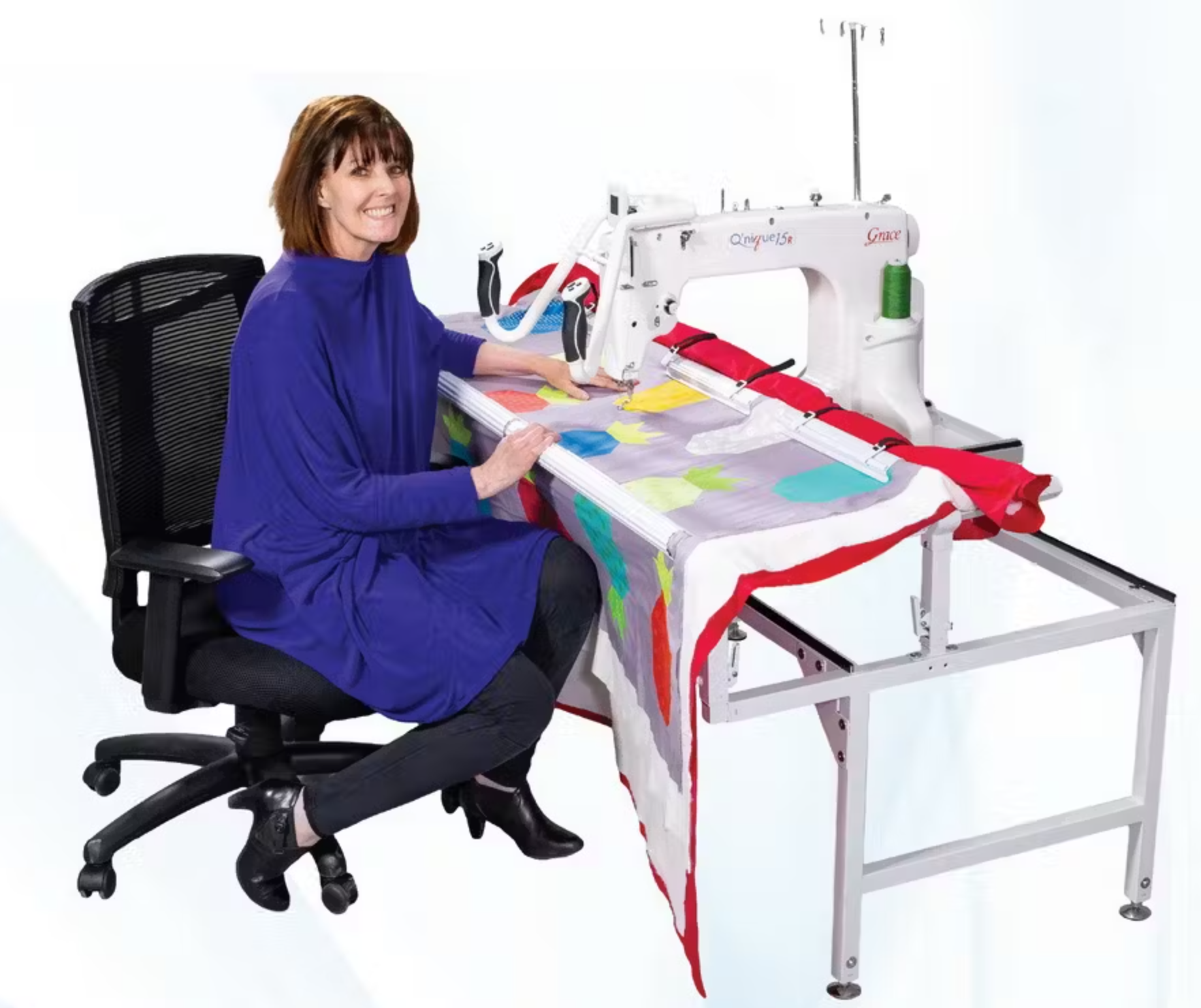 The Grace Q-Zone Hoop Quilting Frame has steel square poles and, combined with the white quilt clips, gives the customer precise ratcheting. As a quilter they can grow with the frame because the arms can extend out in front to accommodate up to a 19" throat machine.