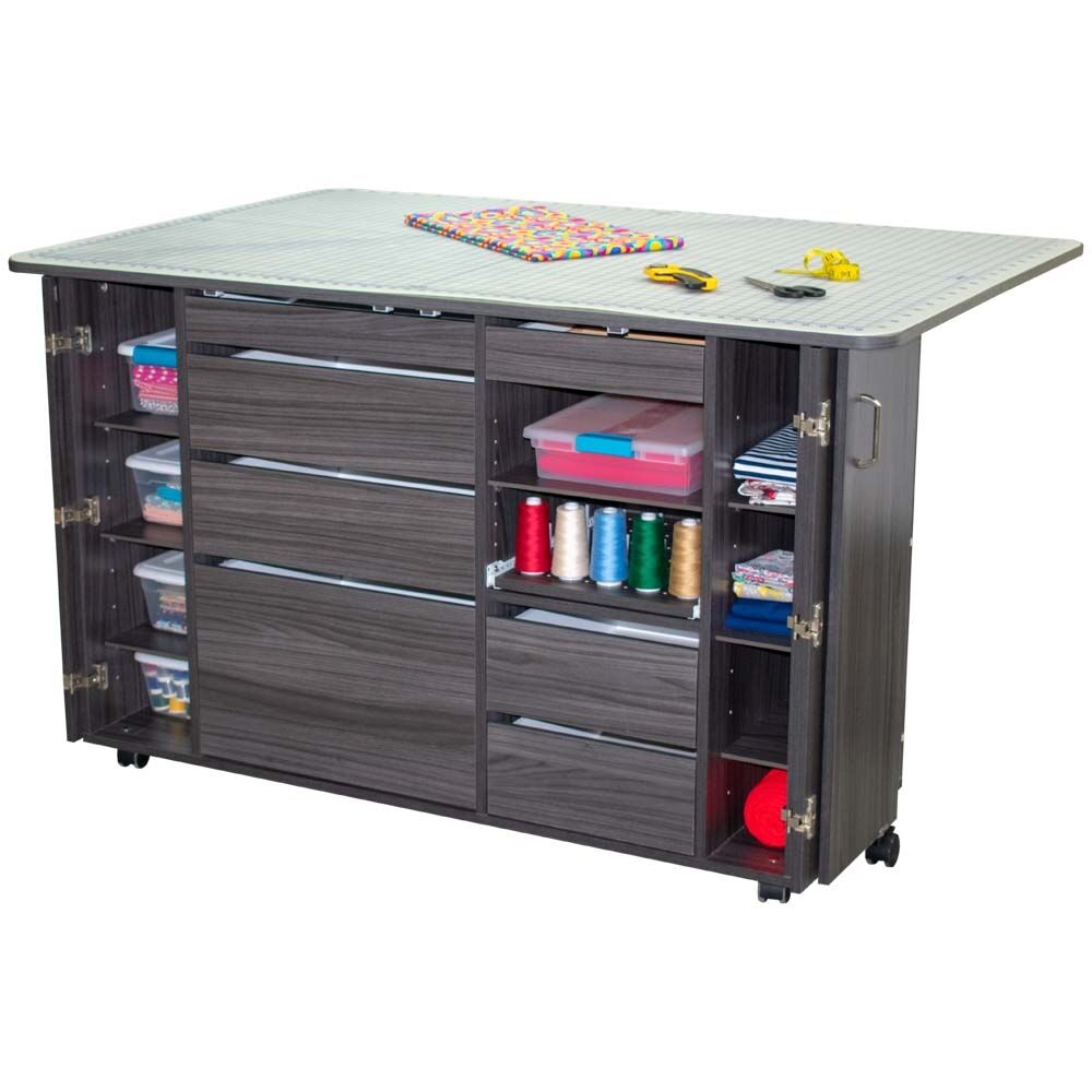 The cabinet comes with a hinged rear drop‑leaf that opens up to 60″ × 40″ (when fully extended), instantly transforming it into a generous work station for cutting, sewing, or quilting projects