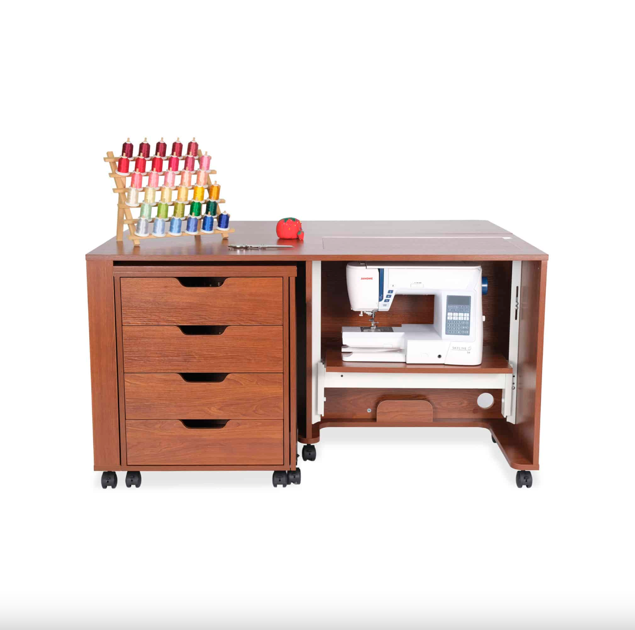 The cabinet includes an expandable caddy that provides a dedicated space for ironing and cutting. Additionally, a rear quilt leaf expands the overall work surface, preventing large projects like quilts from pulling or falling onto the floor. This integrated design streamlines your workflow, allowing you to perform multiple tasks within arm's reach.