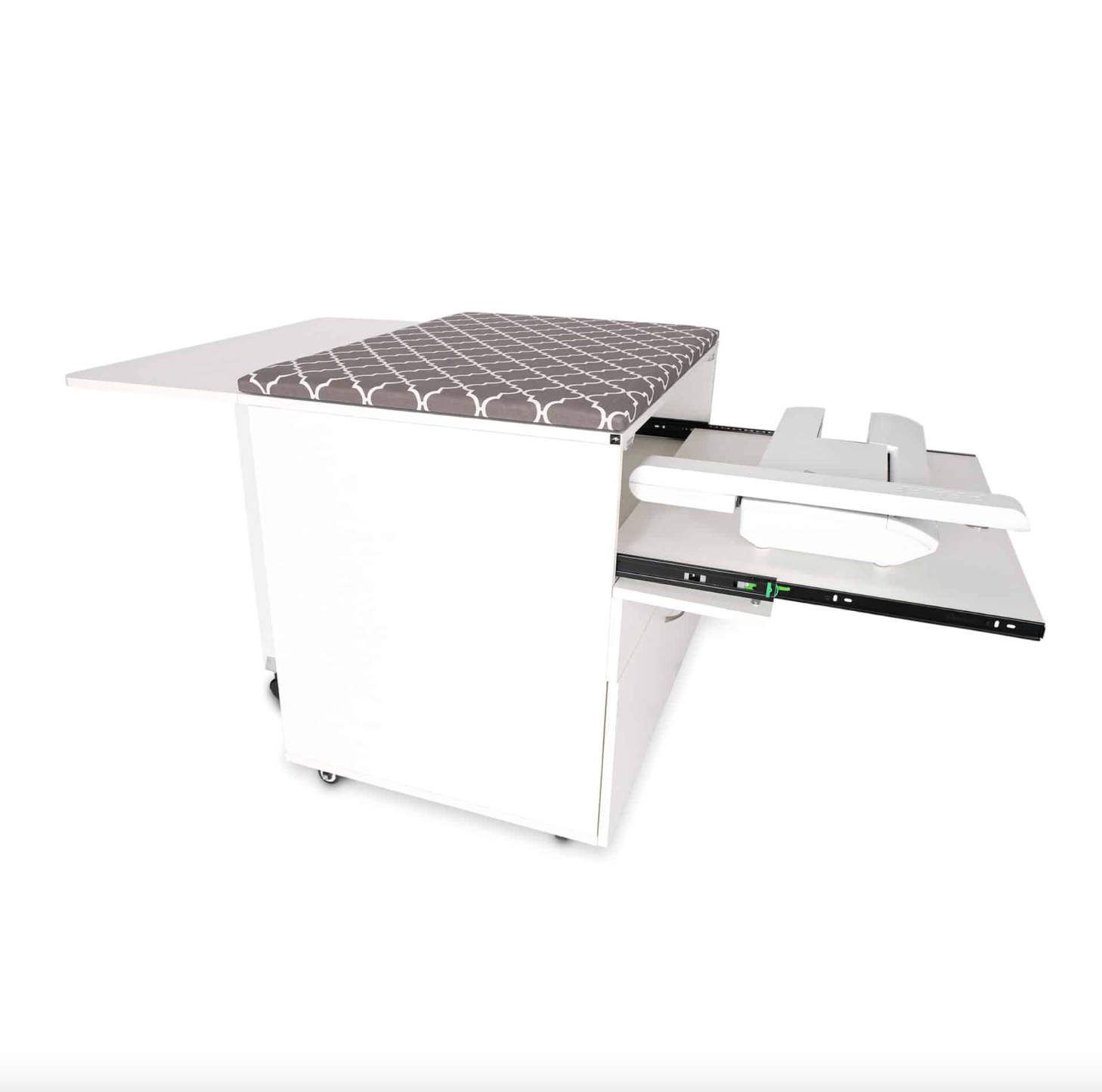 Keep your embroidery machine attachment safe, secure, and within an arm’s reach with MOD Embroidery Storage Arm Cabinet by Kangaroo Sewing Furniture! This upscale embroidery arm storage cabinet features full view, soft-closing drawer technology, complete with a magnetic hatch opening, 2 removable thread racks and a bottom double drawer for expansive sewing and crafting storage options! Beautiful hardware for smooth handling, and a convenient built-in pressing station to top it off!