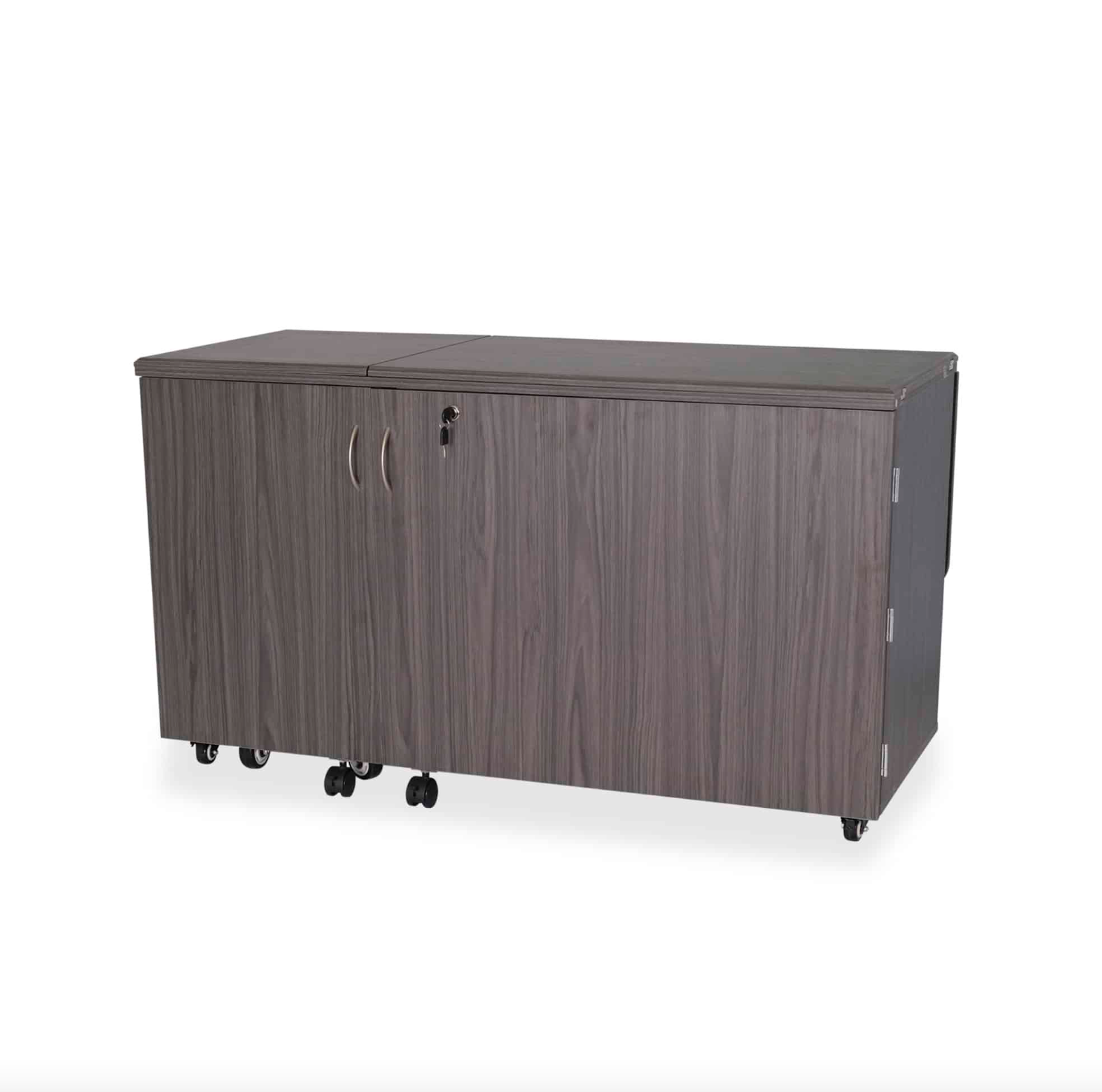 Experience unrivaled comfort and convenience in the premier large-lift sewing machine cabinet from Kangaroo Sewing Furniture, the Kangaroo Outback XL Sewing Cabinet. Specifically engineered to accommodate the largest, premium sewing machines on the market, up to 65 pounds!The Outback XL boasts luxury features like an extra-large 3-position hydraulic lift, or an optional electric powered lift. Large quilt projects are easy with the sprawling worksurface, and the interior embroidery hoop hooks and rolling storage caddy give you the space to stay organized!