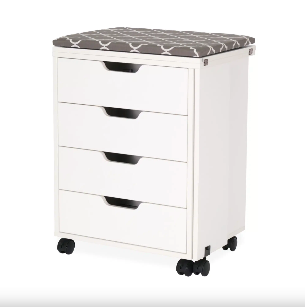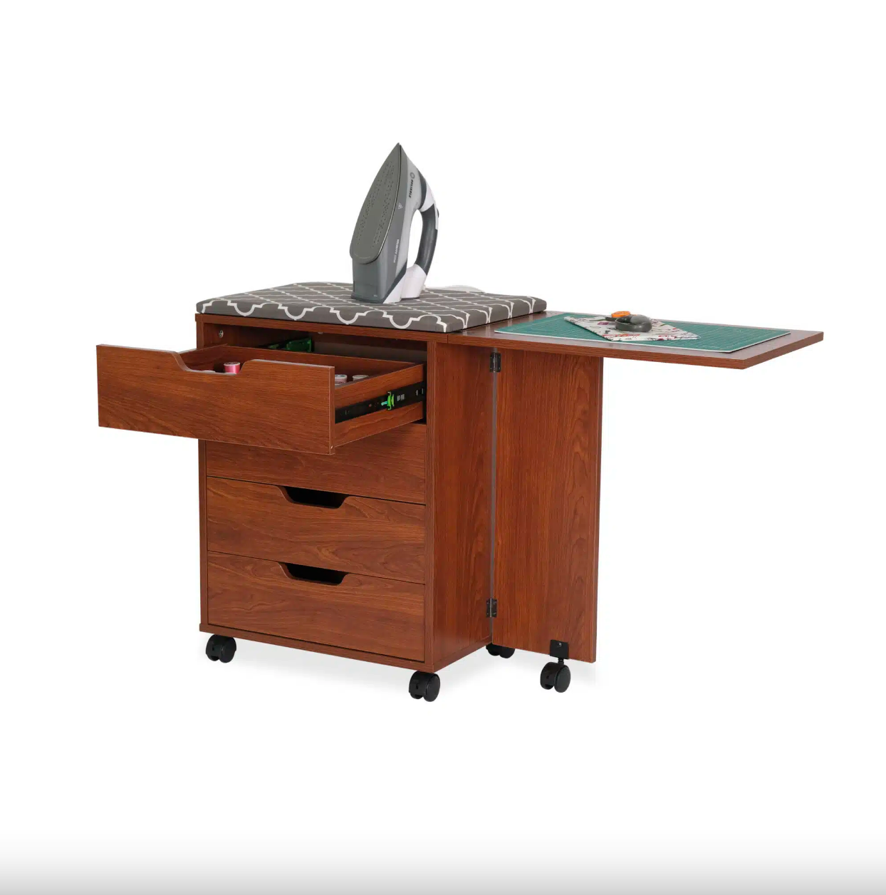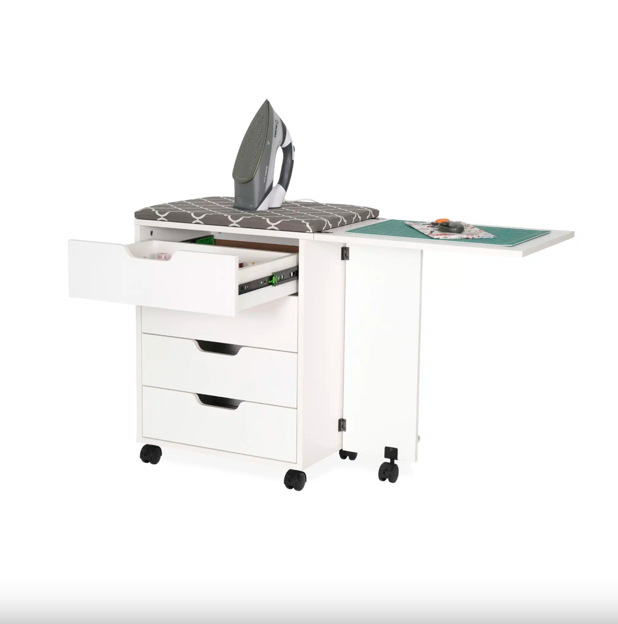 Did someone say storage!? Shirley Storage Cabinet is dynamic, multi-functional storage caddy, designed to perfectly complement your primary sewing workstation – most notably the Laverne Sewing Cabinet by Arrow Classic Sewing Furniture! Shirley features a built-in ironing station, cutting mat, and 4 drawers of dedicate storage for sewing notions and accessories!