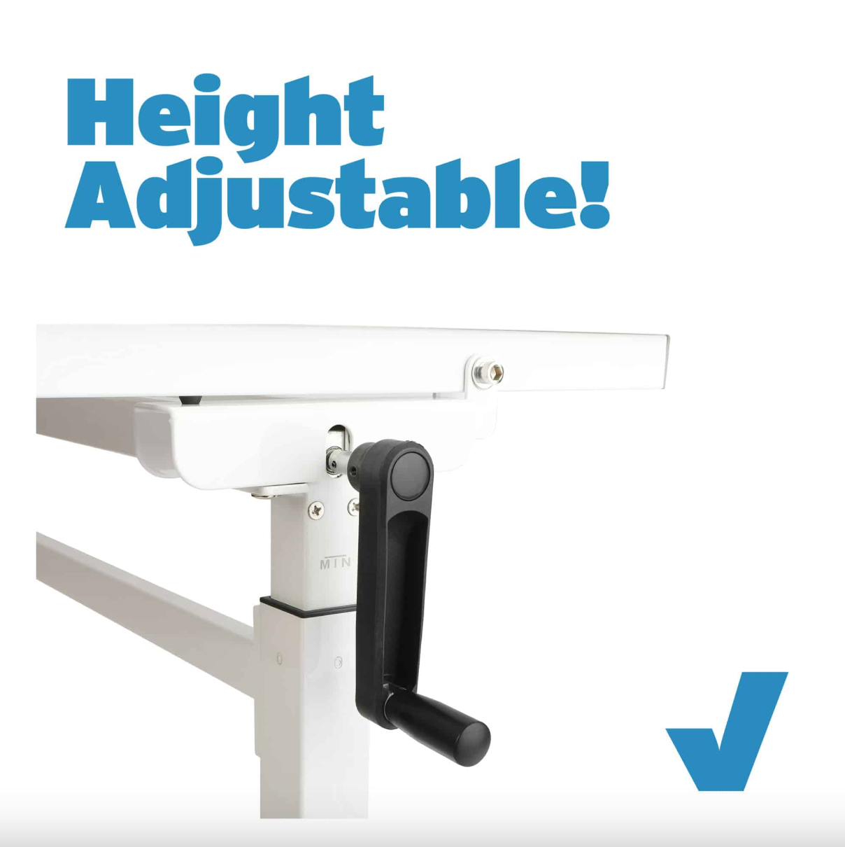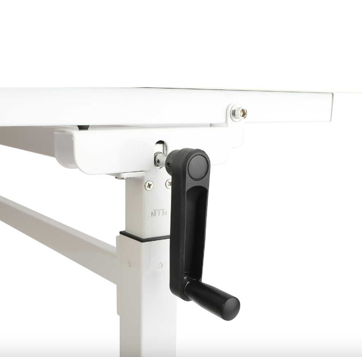 - Transition from sitting to standing with the turn of a crank, moving table from 28-1/2” to 38” tall